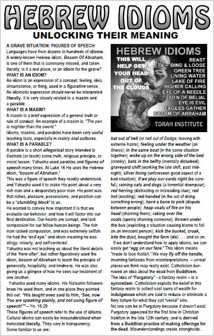 FIGURES OF SPEECH Languages have from dozens to hundreds of idioms. A widely-known Hebrew idiom, Bosom Of Abraham, is one of them that is commonly missed, and taken literally; is it a real place, or an idiom for the grave? WHAT IS AN IDIOM? An idiom is an expression of a