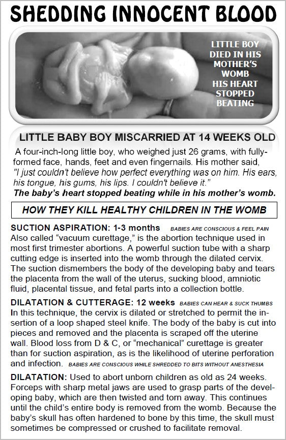 This tract focuses on the treachery inflicted on a healthy baby being slowly shredded in the womb by various techniques. The child is conscious, and torn apart without any anesthesia. We don't euthanize animals with such cruelty.The murder of a child in the womb of a mother will ultimately be judged by our Creator, so this tract is a warning to those who consider it to be merely a medical procedure.Scripture refers to the unborn as "children" at Exodus 21:22.