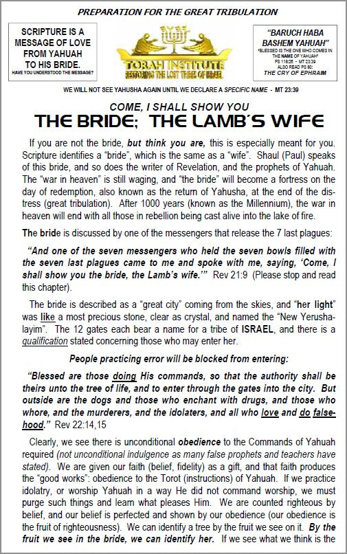 If you are not the bride, but think you are, this is especially meant for you. Scripture identifies a “bride”, which is the same as a “wife”. Shaul (Paul) speaks of this bride, and so does the writer of Revelation, and the prophets of Yahuah.